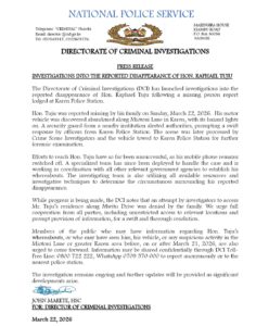 In a statement released on Sunday, March 22, the agency said detectives had already begun looking into the matter after Tuju’s family formally reported him missing.
