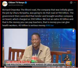 Richard Onyonka has claimed that the government lost an additional KSh 40 billion after cancelling the original tender for the Rironi road project and awarding the contract to a new contractor at a higher cost.