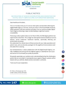 “This is to formally notify you of a service interruption and downtime affecting the Digital Health Agency’s services, which are critical to the Social Health Authority (SHA) operations. We have received notification from our service provider, Digital Health Agency, indicating a major incident leading to significant system unavailability,” SHA said.